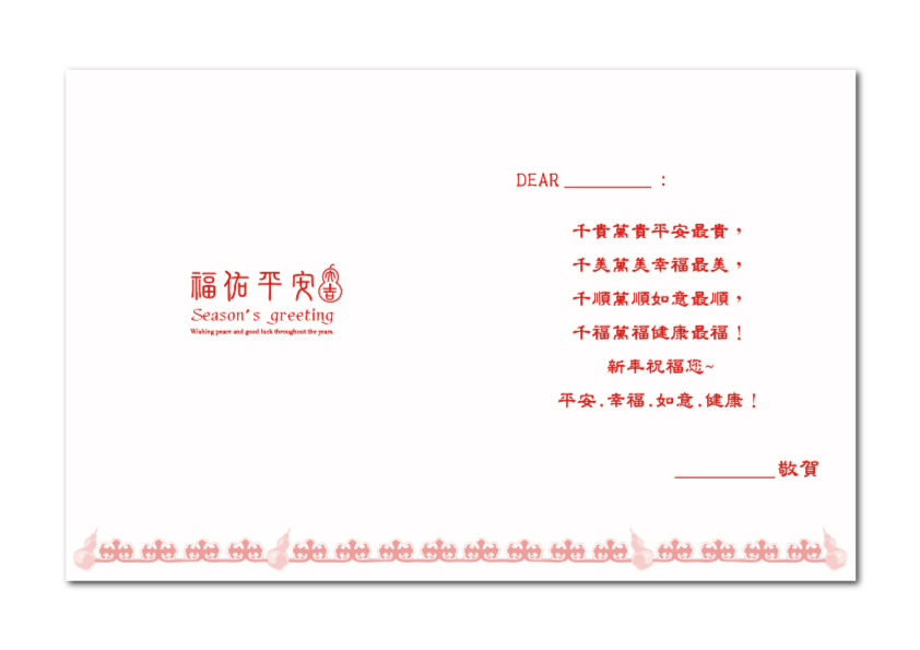 每包數量50張,定價700元,內附對摺襯紙及信封。 │吉祥福祿,平安新春喜盈門。│ 《福佑平安》以紅紙雷雕工藝展現葫蘆造型, 融合「平安福」篆字與祥雲、蝙蝠的傳統吉祥圖騰, 象徵平安喜樂、福氣長存。 局部燙金點綴增添華麗層次, 讓整體更顯細膩典雅,寓意「福隨春來、平安相伴」。 是一款兼具文化底蘊與新春喜氣的典藏賀卡。 **|設計亮點|** ・紅紙雷雕葫蘆造型,寓意福氣綿延 ・結合祥雲與蝙蝠圖樣,象徵招福納吉 ・燙金加工精緻立體,節慶氛圍濃厚 ・內附襯紙適合書寫問候 **|適用族群|** 保險業務、房仲、企業品牌、長輩關懷、節慶贈禮、客戶問候用途