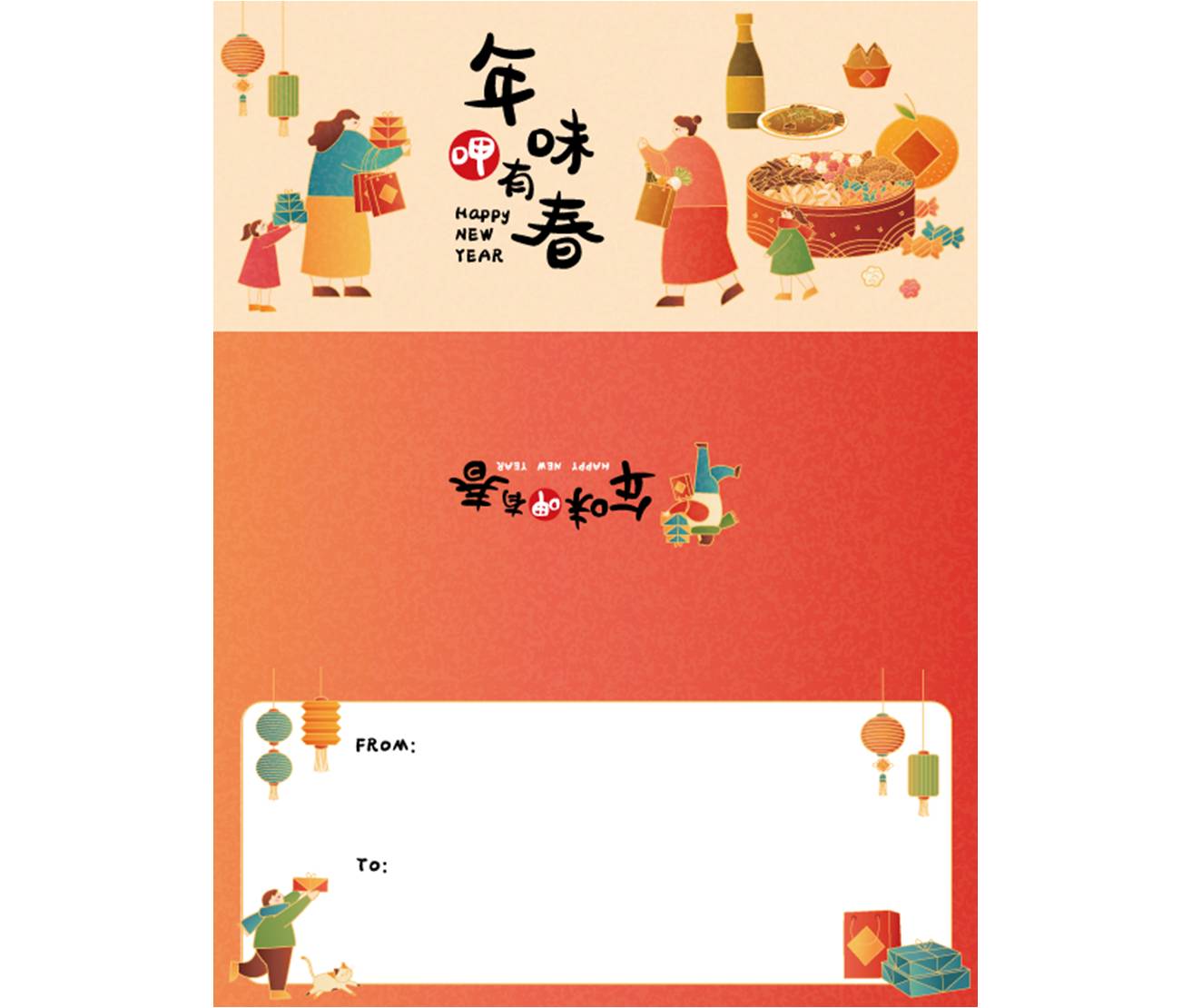 每包數量50張,定價250元,三折信卡附封口貼紙,無需信封。 │年年呷有春,迎富貴拜好年。│ 每到春節,採買年貨、相互拜年送禮成為國民應景活動, 增添新春的喜氣與溫暖情感。 期望年年都能呷有春,迎富貴。 三折信卡設計,開展如展信,內頁空間寬敞, 可書寫新年問候或客戶祝福,讓祝福更真切、年味更濃厚。 **|設計亮點|** 以拜年送禮為靈感,呈現春節人情互動與喜氣氛圍, 融入紅金配色與春節傳統年貨元素,展現美好與豐收的祝福意象。 插畫風格柔和溫暖,卡片質感佳,三折設計兼具美觀與實用性。 **|適用族群|** ・春節拜年送禮主題,溫暖有畫面 ・「呷有春」台味命名,寓意豐盛有餘 ・三折信卡設計,質感兼具實用 ・適合企業賀年、家庭問候、節慶贈卡