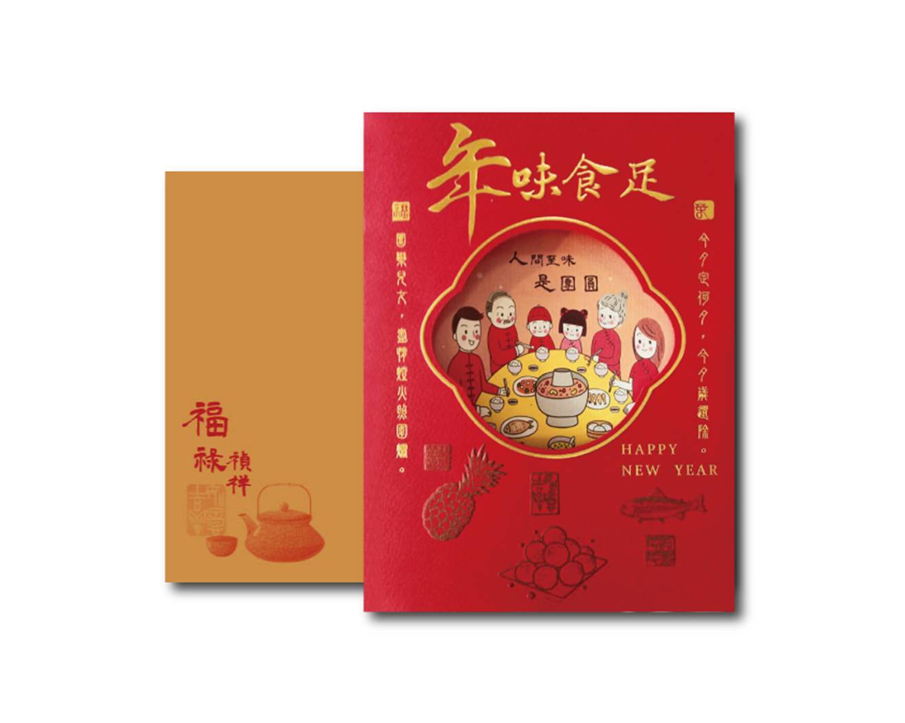 卡片以高級燙金、壓凸印金及裁型工藝打造,質感細膩、視覺豐富,象徵富足喜悅、年年有餘。