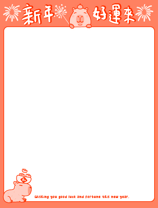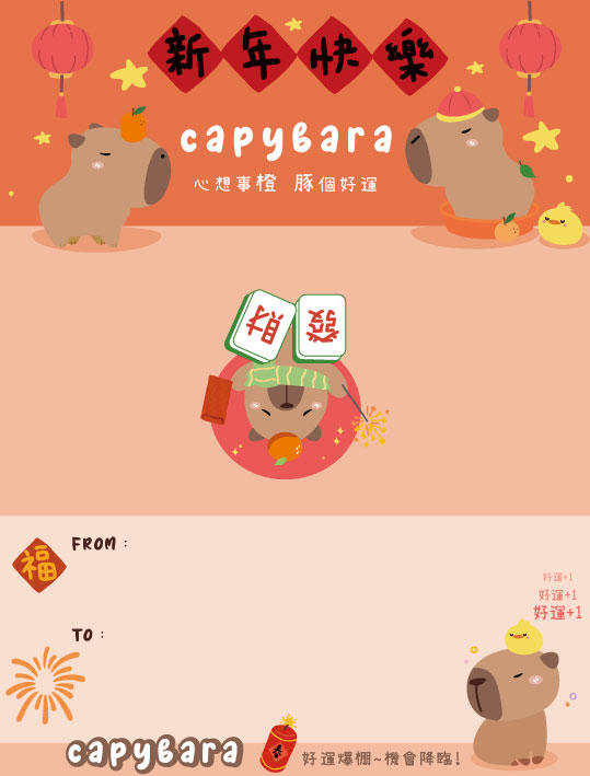 * 以兩隻可愛的水豚相互拜年為主角,洋溢著歡樂與祥和的節日氣氛。