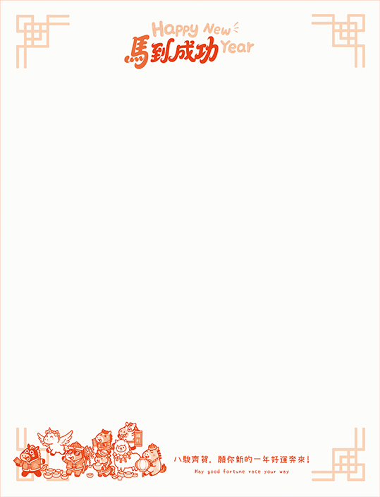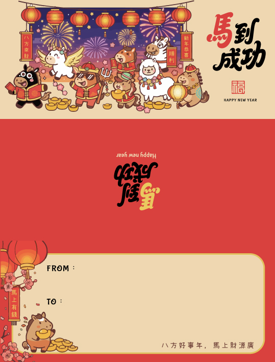 每包數量50張,定價250元,三折信卡附封口貼紙,無需信封。 │ 新年伊始,好運疾馳而來。│ 《馬到成功》以可愛風格重新演繹經典「八駿圖」意象, 讓奔馳的駿馬不再嚴肅,而是充滿朝氣與希望。 漫畫筆觸搭配煙火點綴,象徵熱情與成功啟程。 卡面以三折信卡形式展開,內頁留有充足書寫空間, 適合寫下誠摯的祝福與鼓勵。 無論是送給客戶、夥伴、或親友,皆傳達出「好運連連、事事順心」的能量。 PS.八駿由左至右分別為:黑馬、獨角馬、馬莎拉蒂、馬卡龍、草泥馬、五花馬, 後為赤兔馬,班馬。 **|設計亮點|** ・可愛八駿圖,象徵成功與活力 ・紅橘黃配色,寓意開運與好兆頭 ・三折信卡設計,兼具祝福與書信感 ・適合新年賀禮、開工祝福、升遷慶賀 **|適用族群|** 保險、房仲、企業業務群體、品牌贈禮、節慶送卡用途