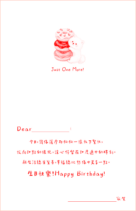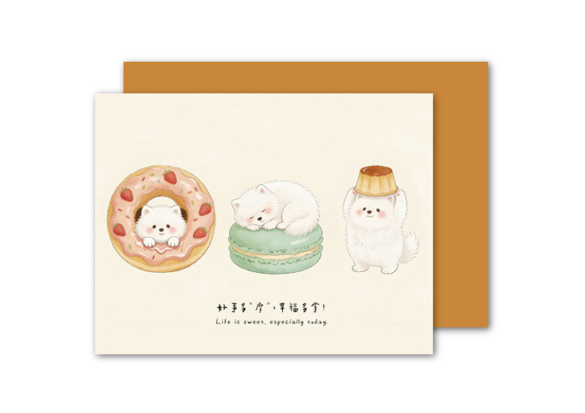 以擁有天使微笑的「薩摩耶」結合甜甜圈、布丁等療癒甜點,打造視覺甜度 100% 的問候。這款卡片透過薩摩耶軟萌、純淨的形象,搭配幽默諧音語錄,讓您的商務問候瞬間化為一份甜進心底的小禮物。