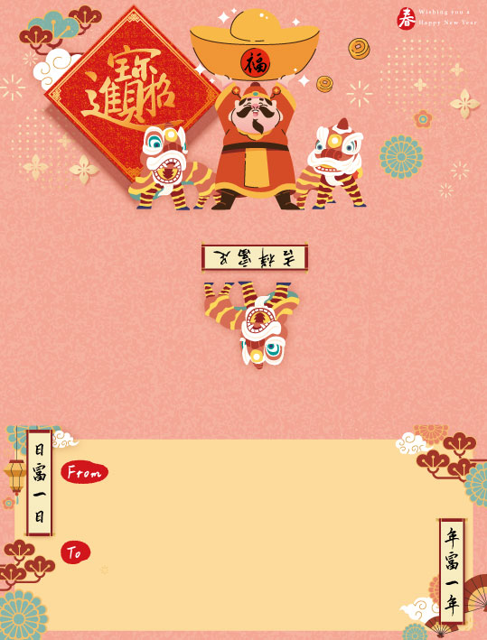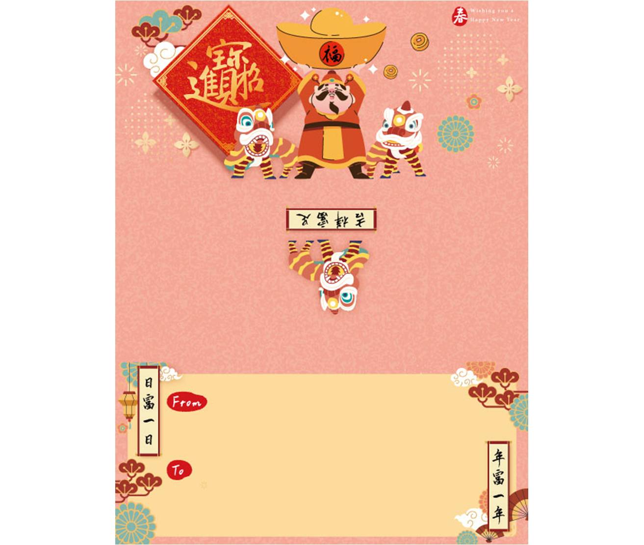 每包數量50張,定價250元,三折信卡附封口貼紙,無需信封。 │財神送福,開春好運!│ 《招財進寶》以俏皮可愛的財神作為主視覺: 封面是一隻抱起大元寶的可愛財神,左右兩側有舞獅熱鬧慶賀, 畫面融入日系新年元素與春天粉色色調,既討喜又保有年節吉慶感。 新的一年,願財源滾滾、事事順心; 這張三折信卡除了傳遞招財寓意,也是一份有趣又有儀式感的祝福。 適合企業大量採購或個人拜年送禮。無論寄給客戶、長輩或朋友, 都能帶來喜氣與好運的祝福。 **|設計亮點|** ・可愛財神抱元寶:主視覺親切討喜,象徵開運招財。 ・左右舞獅慶賀,增加節慶熱鬧感,具視覺張力。 ・結合和風細節(如花飾、織紋),質感清新不俗。 **|適用族群|** 保險業務、房仲、企業採購、精品零售、個人消費者、活動贈品